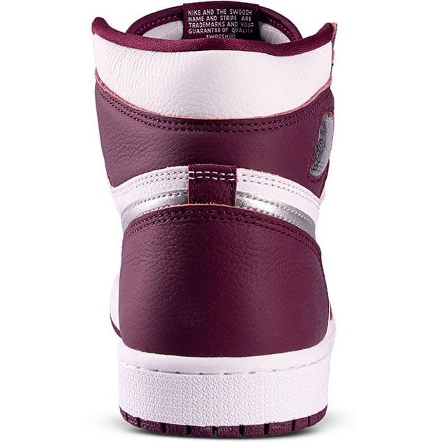 The Air Jordan 1 Retro High OG 'Bordeaux' artfully adorns the classic silhouette with a pristine white leather upper and deep vinous leather overlays at the forefoot, heel, and collar. Echoing the elegance of the CO.JP 'Midnight Navy' colorway, this sneaker is elegantly accented with a metallic silver Swoosh and a jeweled Wings logo on the lateral ankle for a touch of luxury. A woven Nike Air tongue tag rests on the lightly padded nylon tongue, offering a nod to the original design.