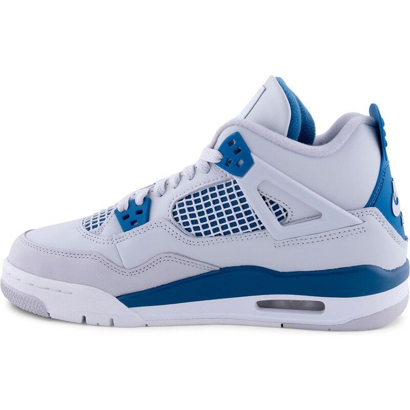 The Jordan 4 Retro Military Blue revives a cherished OG colorway of this iconic silhouette. Smooth off-white leather forms the upper with quarter panel netting and a tonal nubuck forefoot overlay. A striking blue Jumpman logo completes the unique design, matching the molded eyelets and a back tab adorned with Nike Air branding.