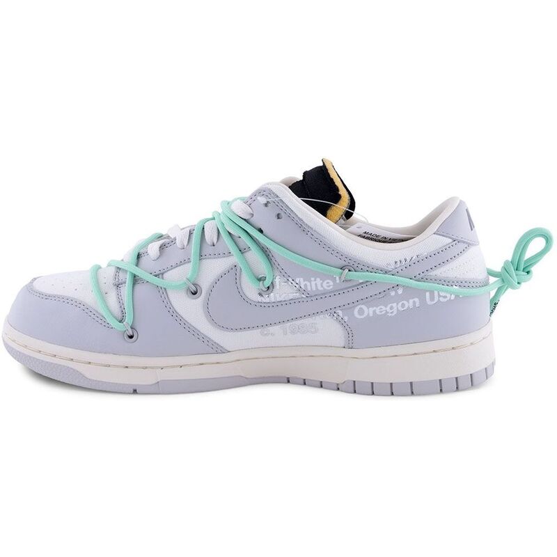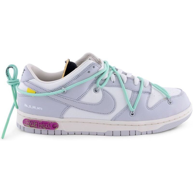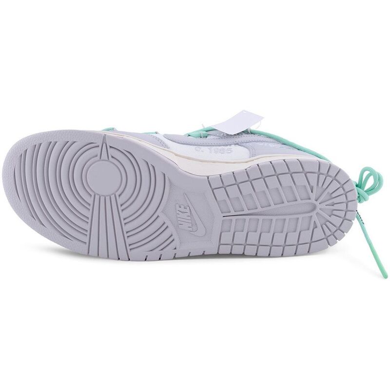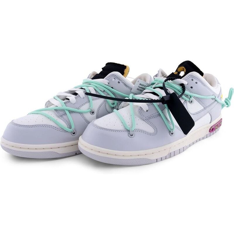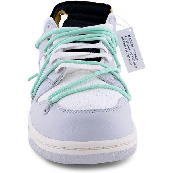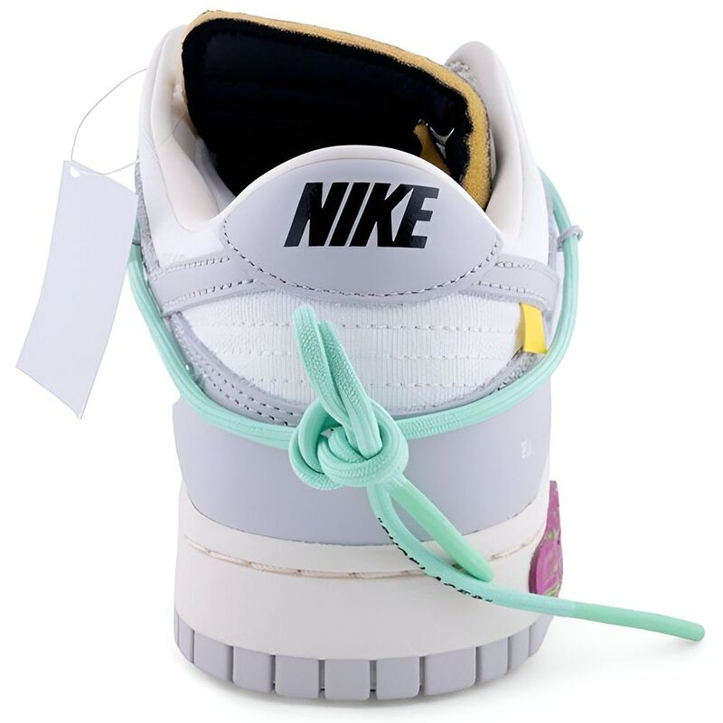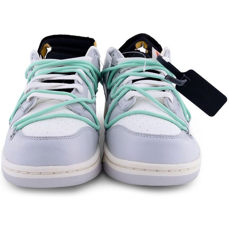 These sneakers elevate Virgil Abloh’s iconic 2019 design, featuring a white leather upper with soft grey suede overlays, a plastic zip tie, and printed Helvetica text. Vibrant accents adorn the secondary lacing, zip tie, exposed-foam tongue, and a rectangular tab on the Swoosh. With only 50 pairs made, each sneakers boast a ‘4 of 50’ badge.