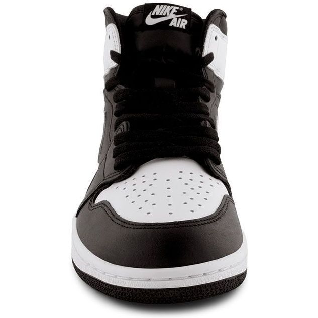 These sneakers feature timeless 'Panda' color blocking in smooth leather. The black base is accented by white on the toe box, Swoosh, heel, and collar overlay, marked with a black Air Jordan Wings logo. A woven Nike Air tag adorns the design, while encapsulated Air-sole cushioning enhances the rubber cupsole with white sidewalls and a black outsole.