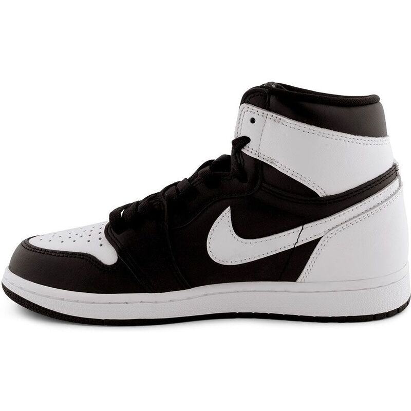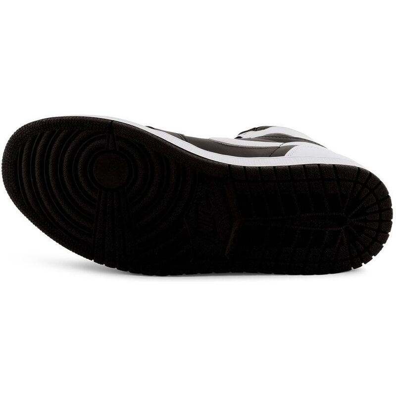 These sneakers feature timeless 'Panda' color blocking in smooth leather. The black base is accented by white on the toe box, Swoosh, heel, and collar overlay, marked with a black Air Jordan Wings logo. A woven Nike Air tag adorns the design, while encapsulated Air-sole cushioning enhances the rubber cupsole with white sidewalls and a black outsole.