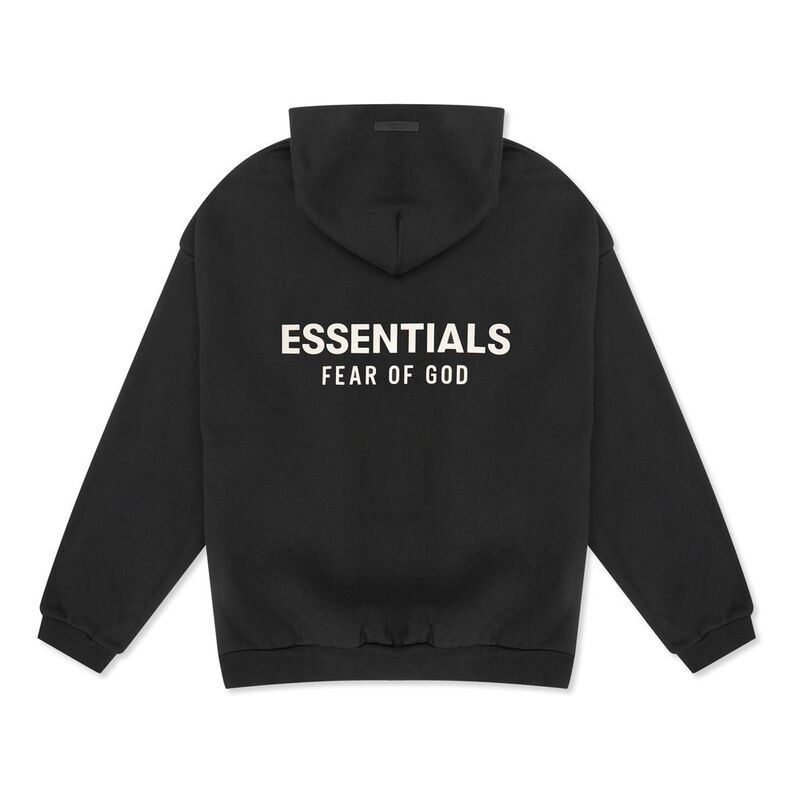 This Fear of God Essentials hoodie in black fleece offers a comfortable, oversized fit. It features a cozy hood, ribbed cuffs and hem for a secure feel, and bold "ESSENTIALS FEAR OF GOD" logo prints on the front and back. This hoodie blends casual comfort with distinctive branding, making it a statement piece for relaxed styling.