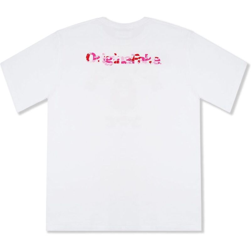 This t-shirt in white and pink celebrates the 5th anniversary of the exclusive collaboration between Bape and Kaws Original Fake, featuring Kaws' distinctive artwork, blending streetwear and contemporary art. It is crafted from premium cotton, blending exceptional comfort with bold design.