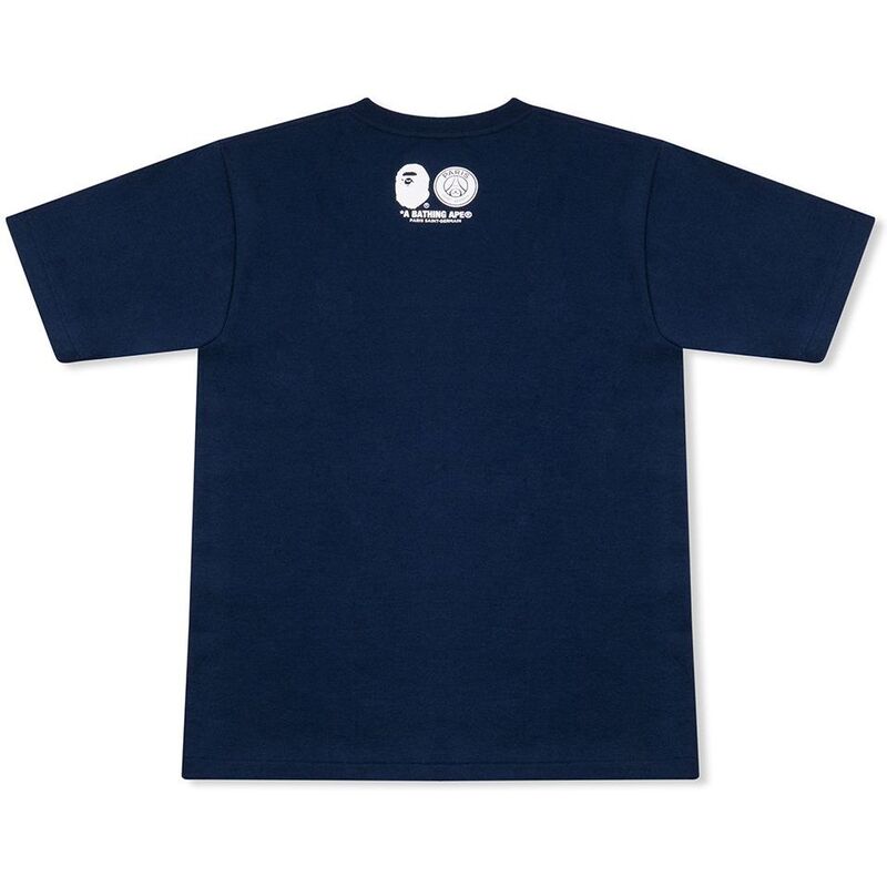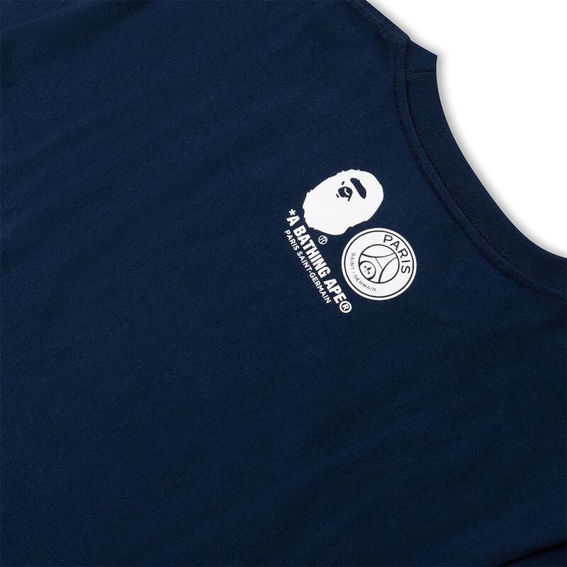 This t-shirt in elegant navy boasts a dynamic blend of streetwear and sports culture, showcasing the iconic Ape Head logo alongside the Paris Saint-Germain emblem. It is crafted from premium cotton, offering exceptional comfort and style, making it a standout piece for fashion-forward football fans.