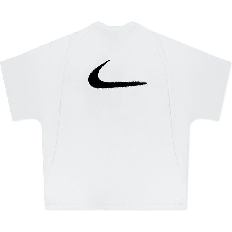 This t-shirt is part of an exclusive eight-piece collection, symbolizing the prestigious collaboration between two distinguished luxury brands. It features black spray dots on the front, lending the white backdrop an elegant artistic touch. This sophistication is reinforced by the iconic Nike Swoosh placed on the back and left chest with great precision.