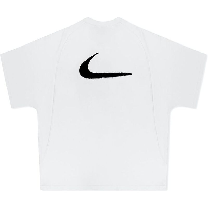This t-shirt is part of an exclusive eight-piece collection, symbolizing the prestigious collaboration between two distinguished luxury brands. It features black spray dots on the front, lending the white backdrop an elegant artistic touch. This sophistication is reinforced by the iconic Nike Swoosh placed on the back and left chest with great precision.
