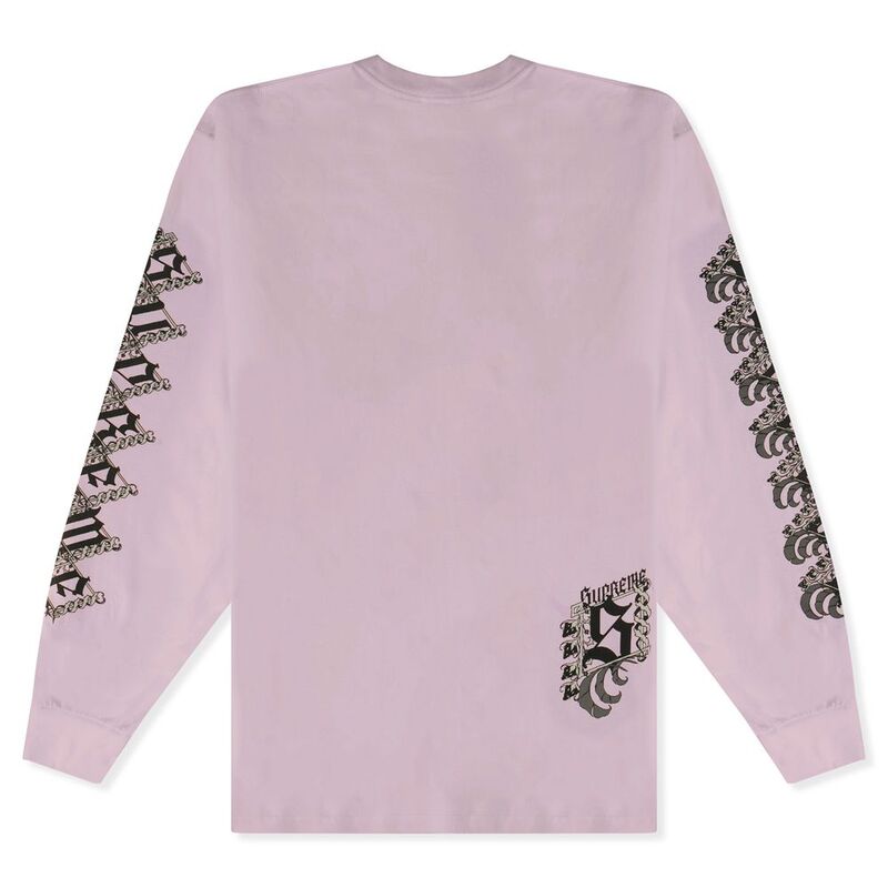 The Supreme Strawberries Long Sleeve Tee in light purple showcases a bold take on the word "Supreme," with each letter filled with a repeating pattern of black strawberries accented by grey details. This eye-catching design extends down both sleeves, adding a dynamic and cohesive look.