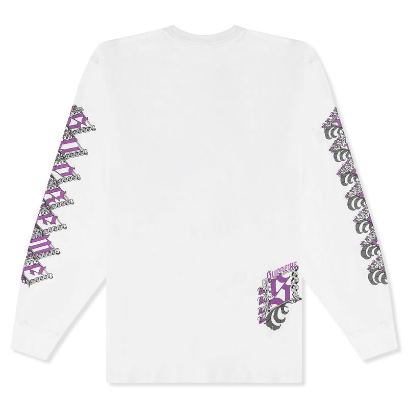 The Supreme Strawberries Long Sleeve Tee in white showcases a bold take on the word "Supreme," with each letter filled with a repeating pattern of purple strawberries accented by black and grey details. This eye-catching design extends down both sleeves, adding a dynamic and cohesive look.