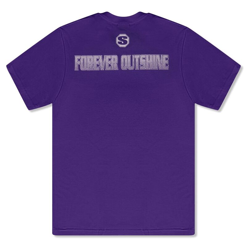 The Supreme Blockbuster Tee in purple offers a playful take on the brand's iconic "S" logo in white, with a stylized octagonal border and bold, shadowed lettering. Beneath the "S" emblem, the word "Supreme" is subtly incorporated. The back of the tee features the "S" logo, with the tagline "FOREVER OUTSHINED" boldly emblazoned below.