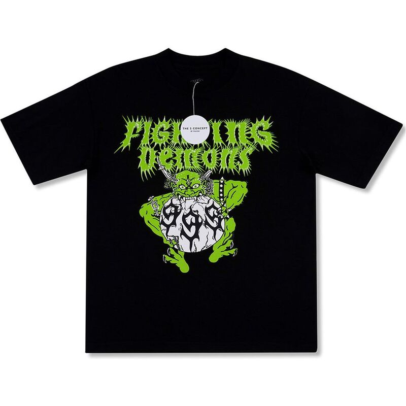 This tee in black embodies an exceptional blend of artistic expression and luxury craftsmanship. The front showcases Vlone's intricate "Fighting Demons" graphic in green, merging elegantly with the sleek black design. Crafted with meticulous attention to detail, it reflects both urban edge and high-end fashion.