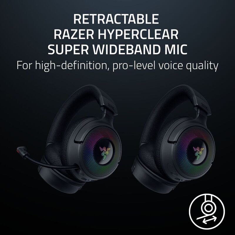 Unleash the limits of immersion with the Razer Kraken V4 wireless gaming headset. Enjoy the freedom and versatility to connect to various devices via Razer HyperSpeed Wireless, Bluetooth, or a USB wired connection. Connect to your favorite systems and devices like your PC, Mac, PlayStation, Nintendo Switch, Steam Deck, ROG Ally, and Smartphone. The Retractable Razer HyperClear Super Wideband Microphone provides superior sound quality & clarity for crystal-clear team comms, and sits flush with the headset when fully retracted. Razer’s patented TriForce Titanium 40mm Drivers allows for tuning of high, mid, and low frequencies individually, ensuring a powerful, lifelike auditory experience. The headset supports THX Spatial Audio, a cutting-edge 7.1 surround sound that delivers realistic positional audio and expands your soundstage with custom-tuned THX Game Profiles for over 60 game titles. Seamlessly adjust your audio mix to stay fully immersed in the action and connected with your team with the Game/Chat Balance function. It also features 9-Zone Earcup Lighting, with increased lighting zones to support more Razer Chroma™ RGB effects, customize each one individually to achieve stunning visuals and light up your battlestation. Redefine how you play in every way imaginable with the Razer Kraken V4.