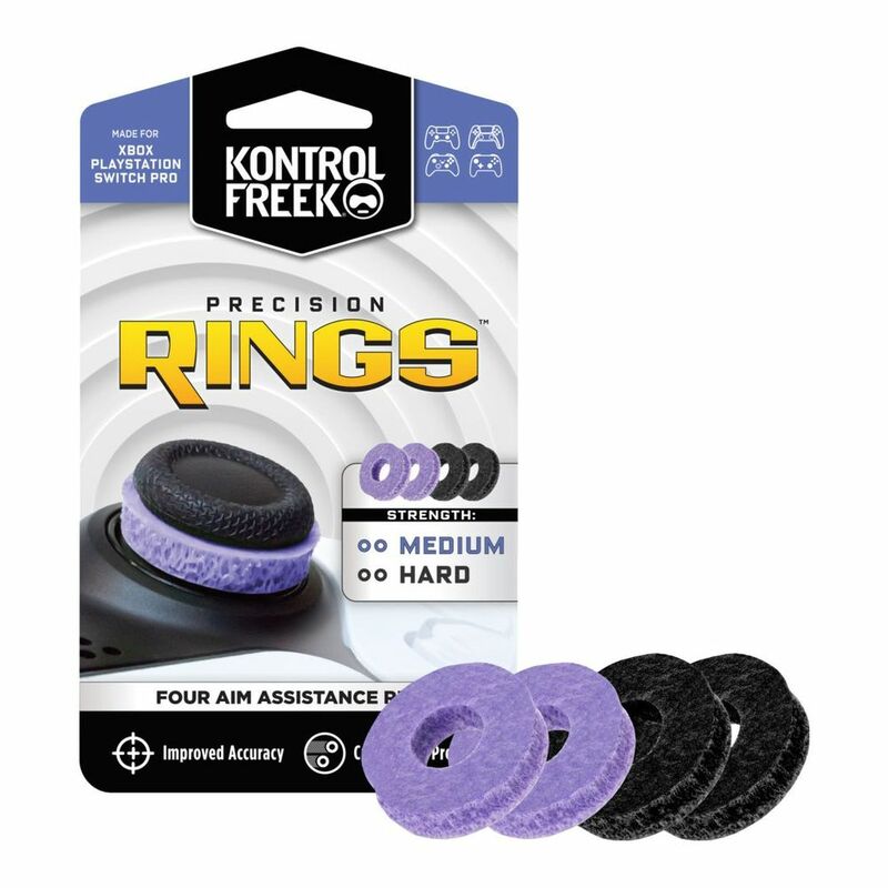 We aim to show you accurate product information. Manufacturers, suppliers and others provide what you see here, and we have not verified it. See our disclaimer Kontrol Freek Precision Rings are made from a unique material that adds resistance to your stock thumb sticks so you can take more accurate shots, even at max in-game sensitivities. Precision Rings are available in three strengths: soft (Green), medium (Purple) and hard (Black). The higher the strength, the higher the resistance and the more tension you will feel as you move your analog sticks. Not sure which level to choose? Try our six-ring mixed pack which includes two soft rings, two medium rings and two hard rings.