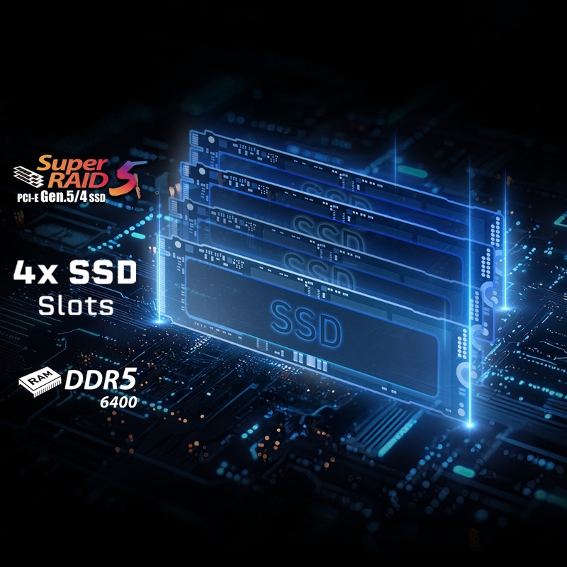 - 4 x SSD slots (include 1 x PCIe Gen5 SSD slot)