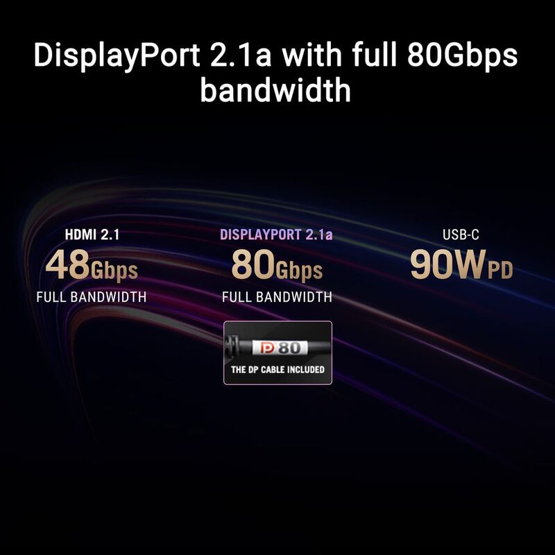 - Extensive connectivity options include DisplayPort™ 2.1a UHBR20 with full 80Gbps bandwidth, USB-C® (90W PD), HDMI® 2.1, and a tripod socket