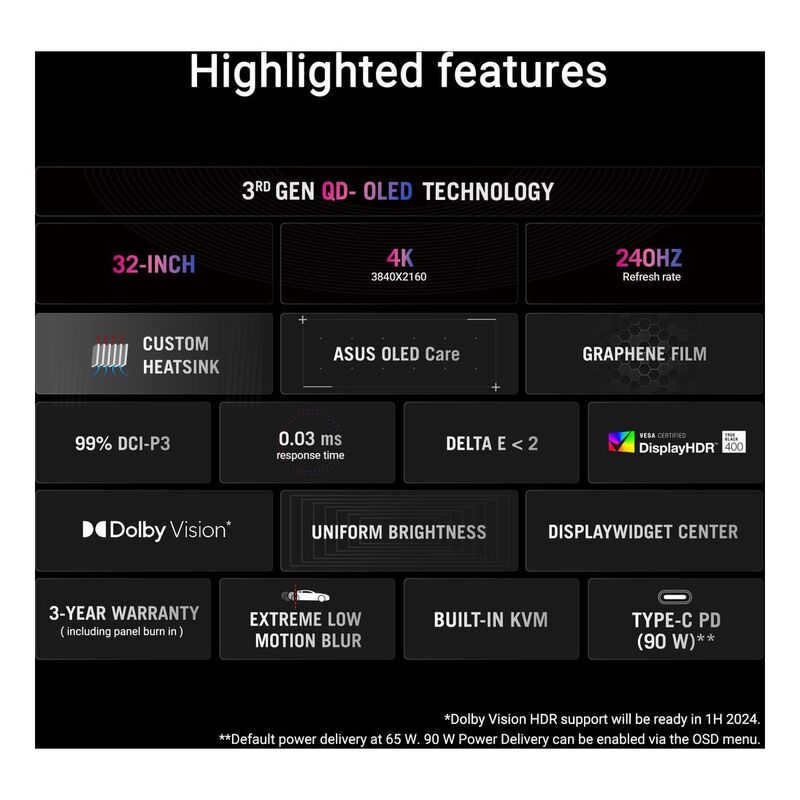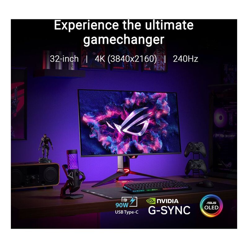- 32-inch 4K (3840 x 2160) QD-OLED gaming monitor with 240 Hz refresh rate and 0.03 ms (GTG) response time for immersive gaming