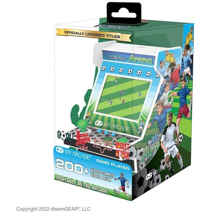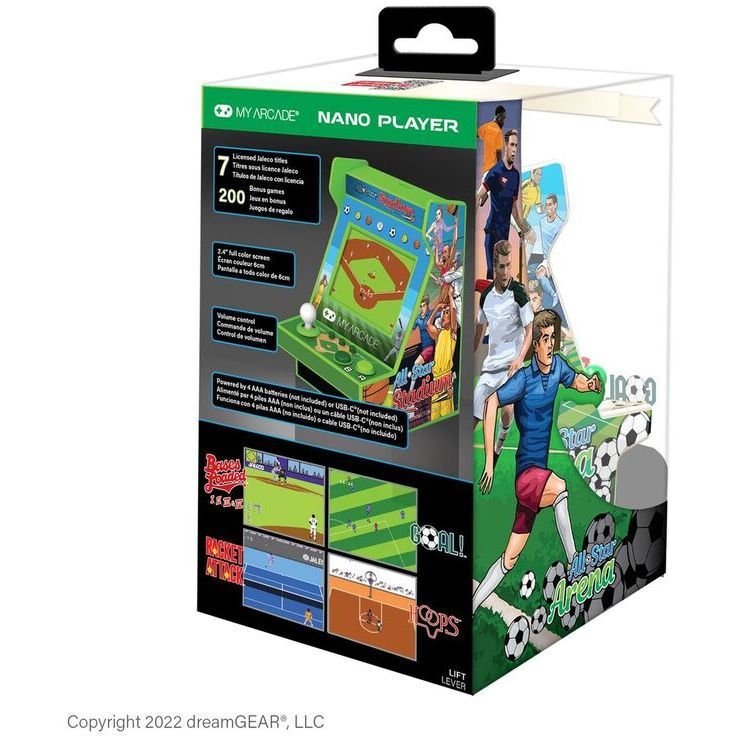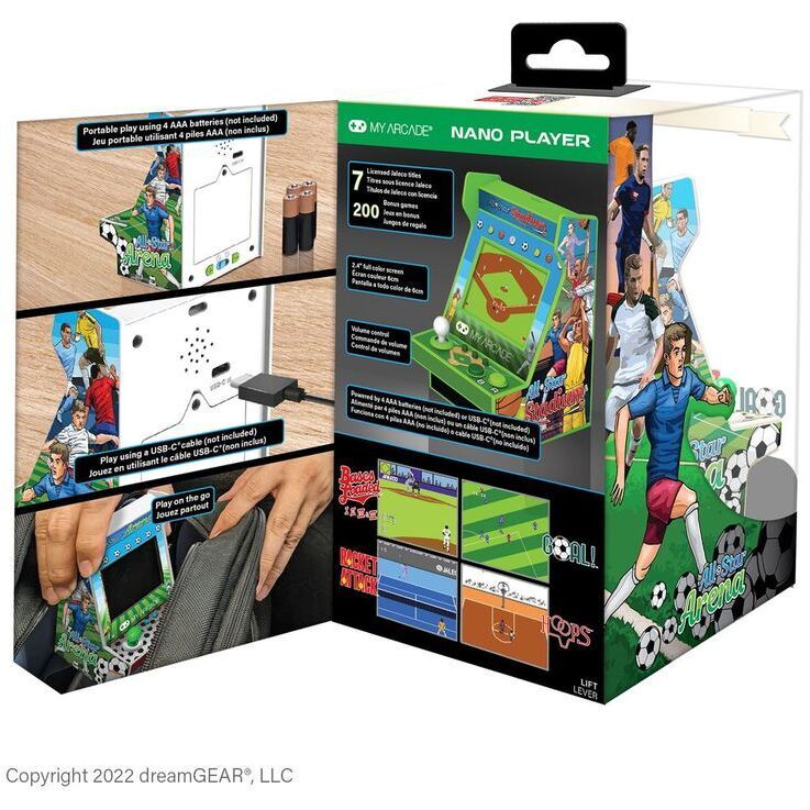 Includes fully playable versions of GOAL!™, BASES LOADED™ 1,2,3 & 4, RACKET ATTACK™ and HOOPS™.The All-Star Arena Nano Player features a full color 2.4" screen to brightly display all 7 titles and is fine-tuned for hours of play through its emphasis on ergonomics and compact design.