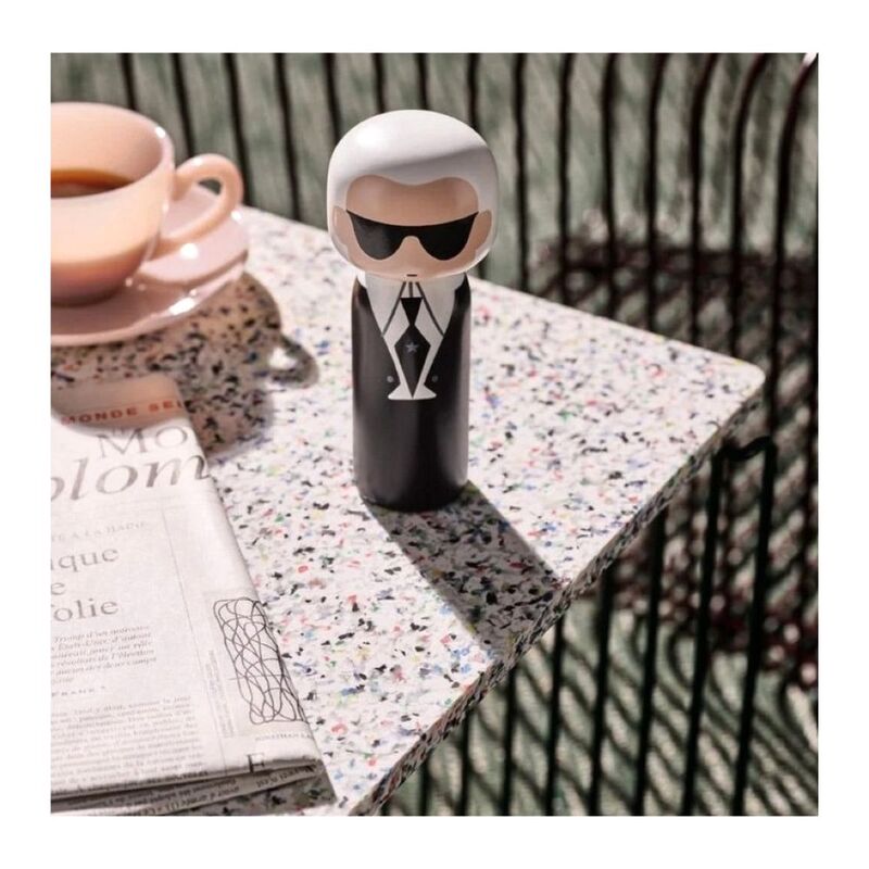 The Karl kokeshi is a unique wooden doll that pays homage to fashion designer and creative director, Karl Lagerfeld. He’s wearing his signature high-collared shirt, black tie, and sunglasses, all inspired by his unmistakable fashion sense. This kokeshi captures the essence of his innovative and visionary approach to fashion.