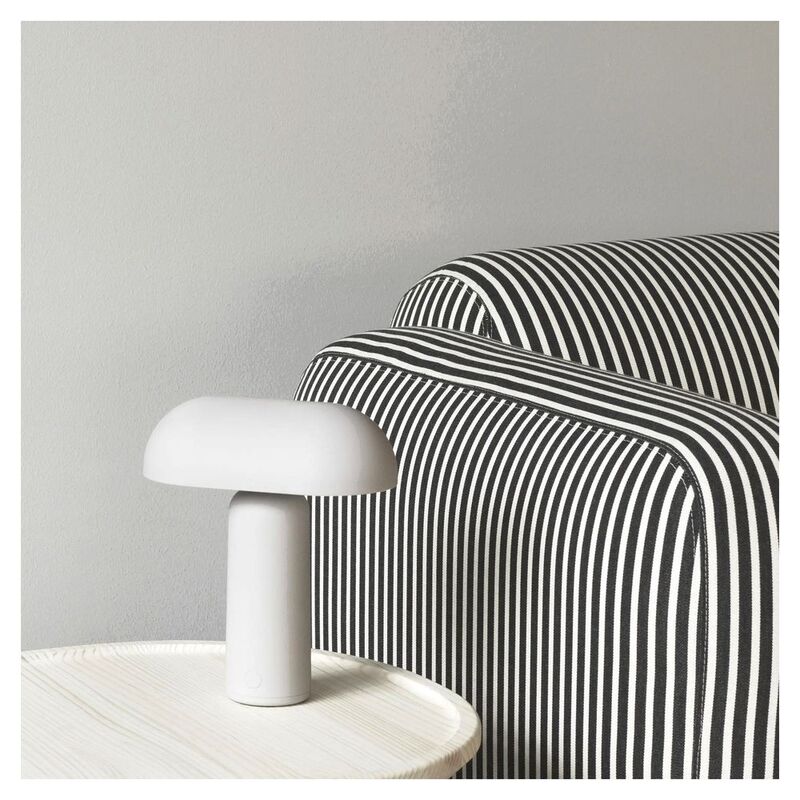 Concept: The Porta the table lamp is Normann Copenhagen's first portable lamp. This compact lamp has a modern organic design with a cylindrical base and an elongated dome-shaped lampshade. The cordless and lightweight design makes it easy to bring light to any corner of your home and move it from room to room or out onto the balcony or patio. A touch-sensitive dimmer allows for three different light settings depending on the desired mood, while a discreet USB charger cable ensures easy charging when needed.