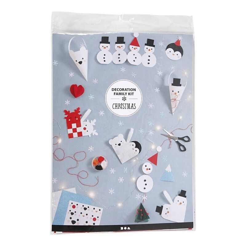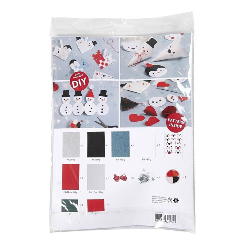 Contents: Three colours of glitter paper, red and white cotton string for suspension, Silk Clay and cardboard in different colours, white and red glossy paper, stickers with eyes and noses, and 10g sequins.