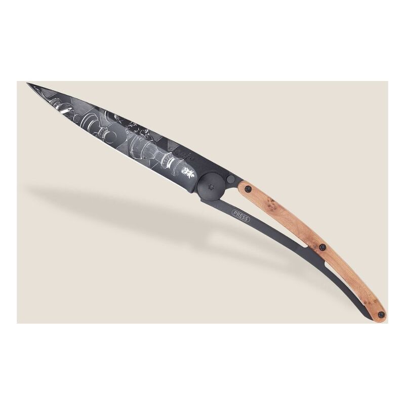 The juniper that adorns the handle of this Deejo knife is a naturally fragrant wood, offering a slightly peppery scent. In arabesques of beige, each handle plate, finely veined, makes your Deejo an exquisite and unique piece.