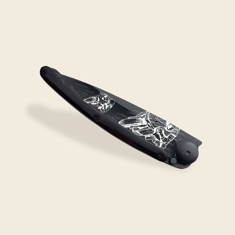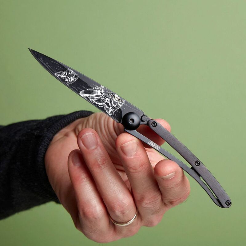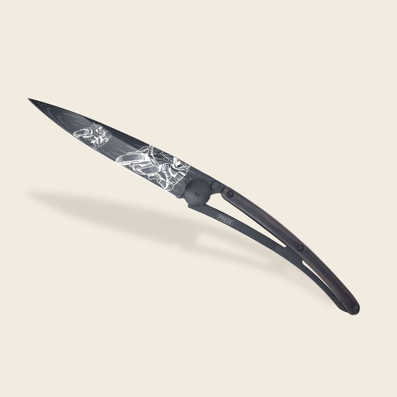 Deejo 37G Pocket Knife - Ebony Wood/Moto Racing (Grey)