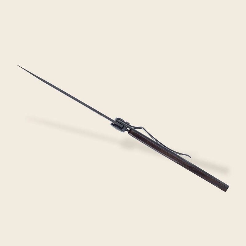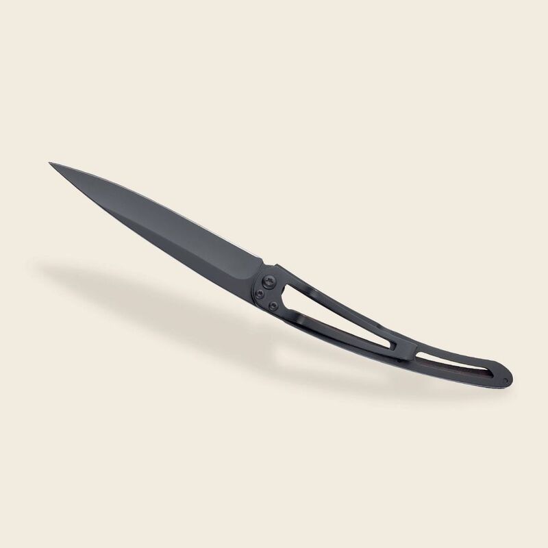 Ultra-light knife in Z40C13 stainless steel, grey titanium coating. Blade with secure liner lock system decorated with fine laser engraving. Belt clip. Ebony handle. Scratch resistant.