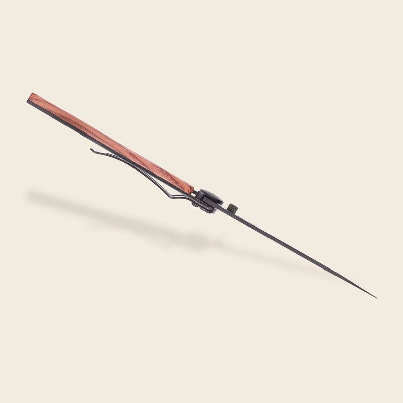 Ultra-light knife in Z40C13 stainless steel, black titanium finish. half serrated blade. one hand opening. Secure liner lock system. Belt clip Coral Wood Handle. Scratch resistant.