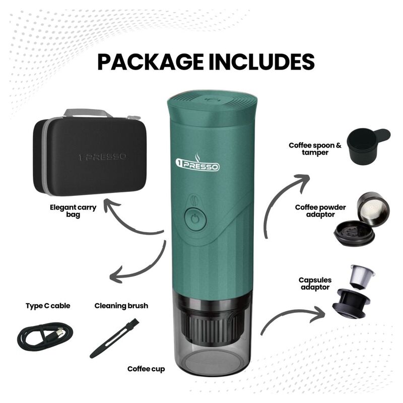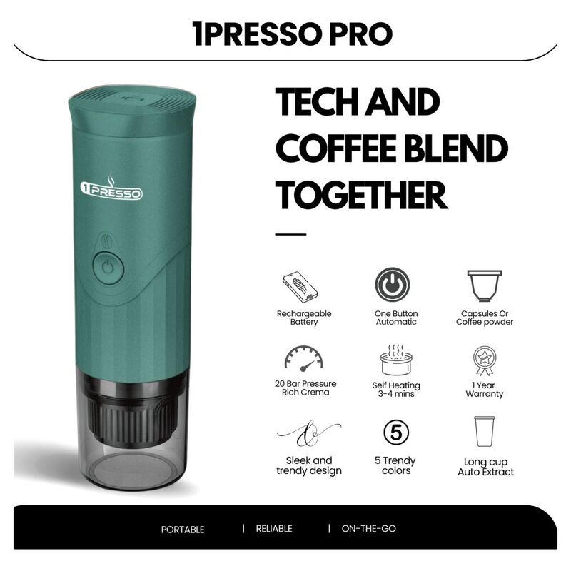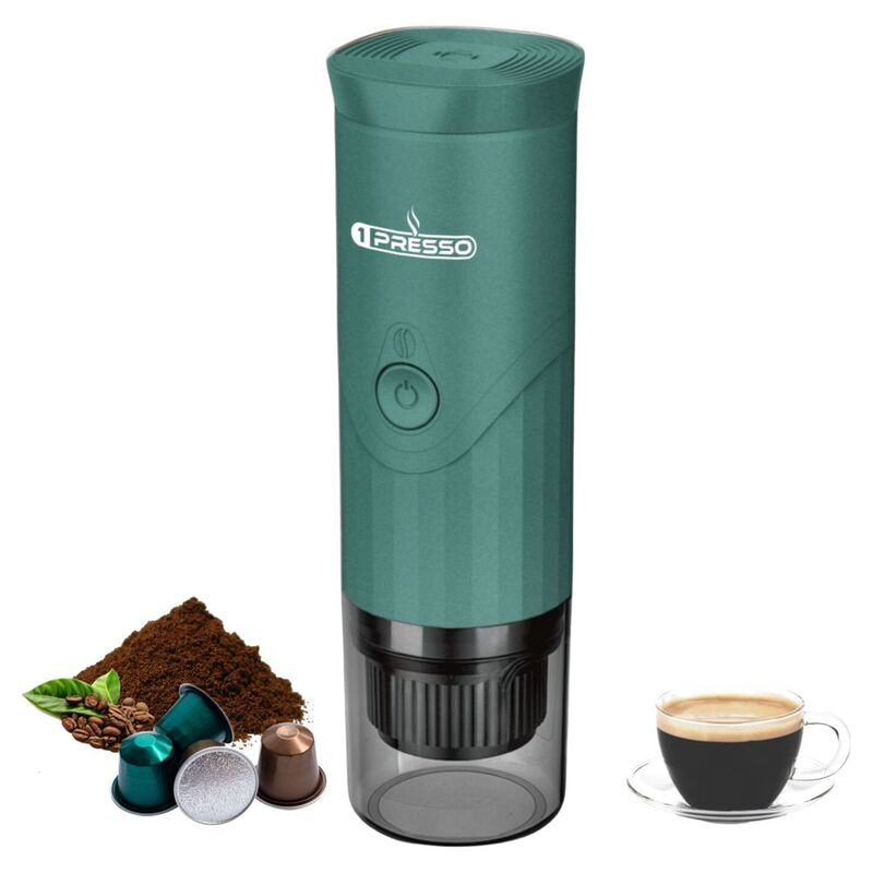 1Presso PRO Portable Automatic Espresso Coffee machine - Self heating, 20 Bar Coffee Maker, With Ground Coffee & NS capsules for Camping, Travel, Outdoors, Office and Home (Green)