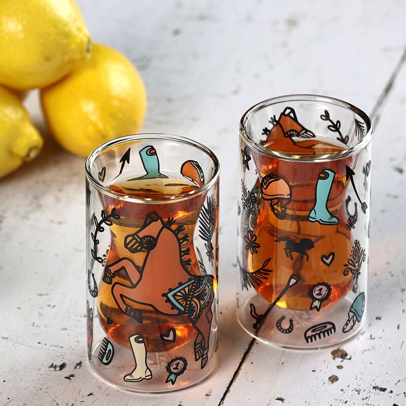 Charmingly illustrated with a playful equestrian-inspired motif featuring horses, rosettes, boots, and horseshoes in a quirky sorbet-hued palette, this set of 2 double-walled tea cups was designed with functionality in mind. The glass set can be used for both hot and cold drinks.