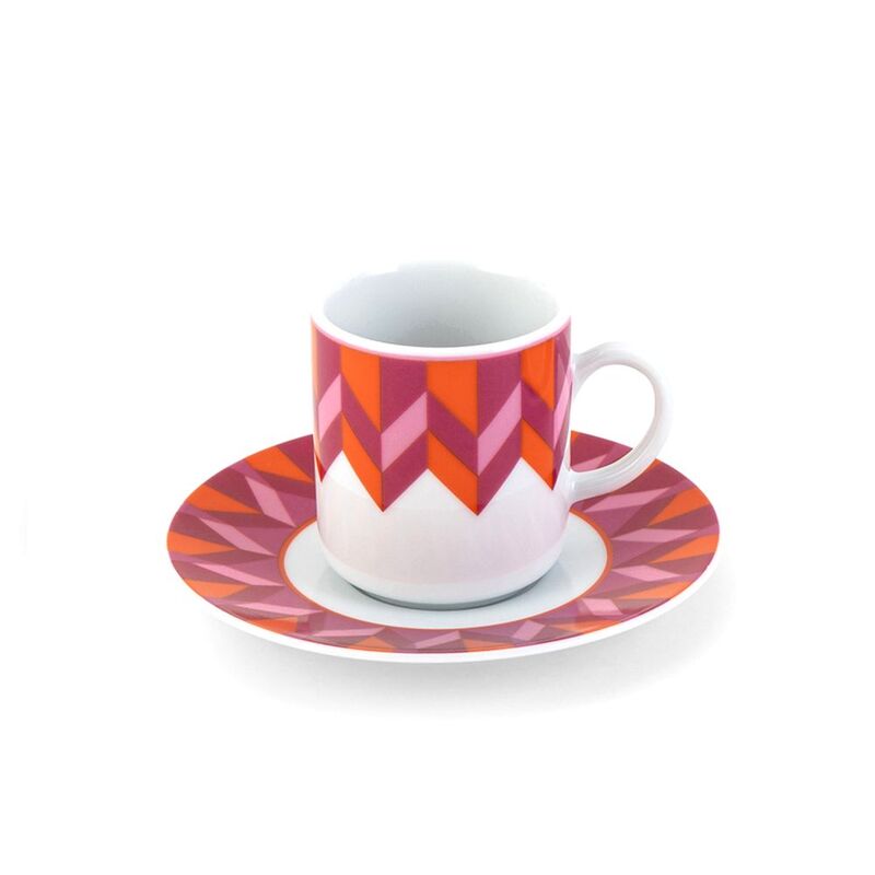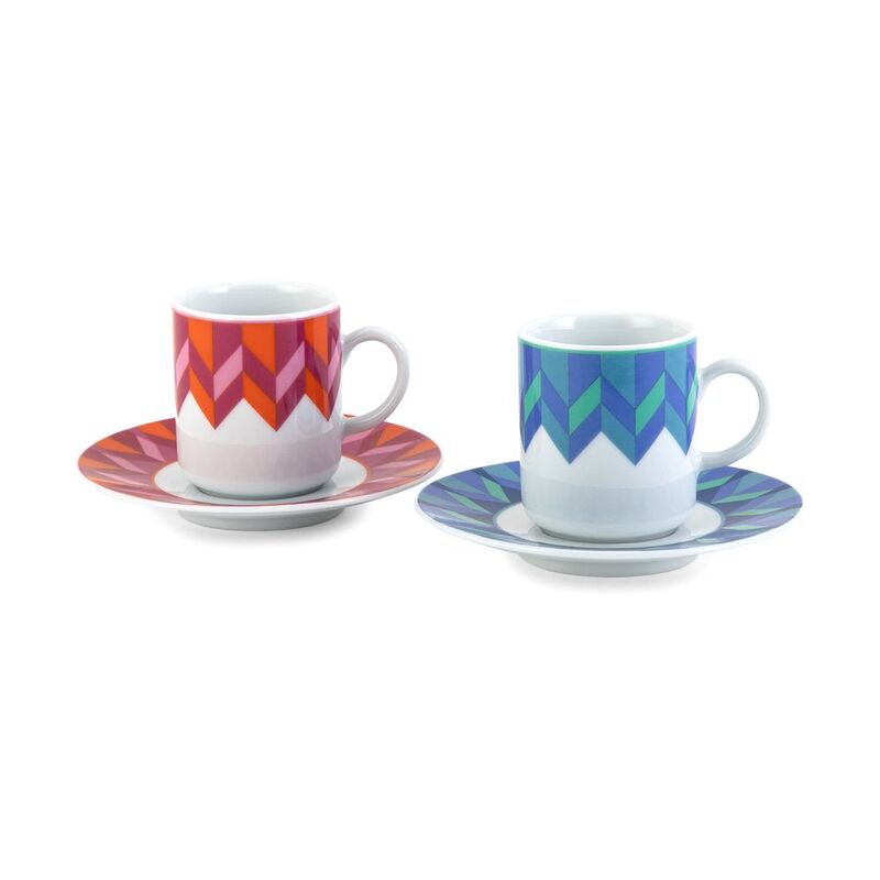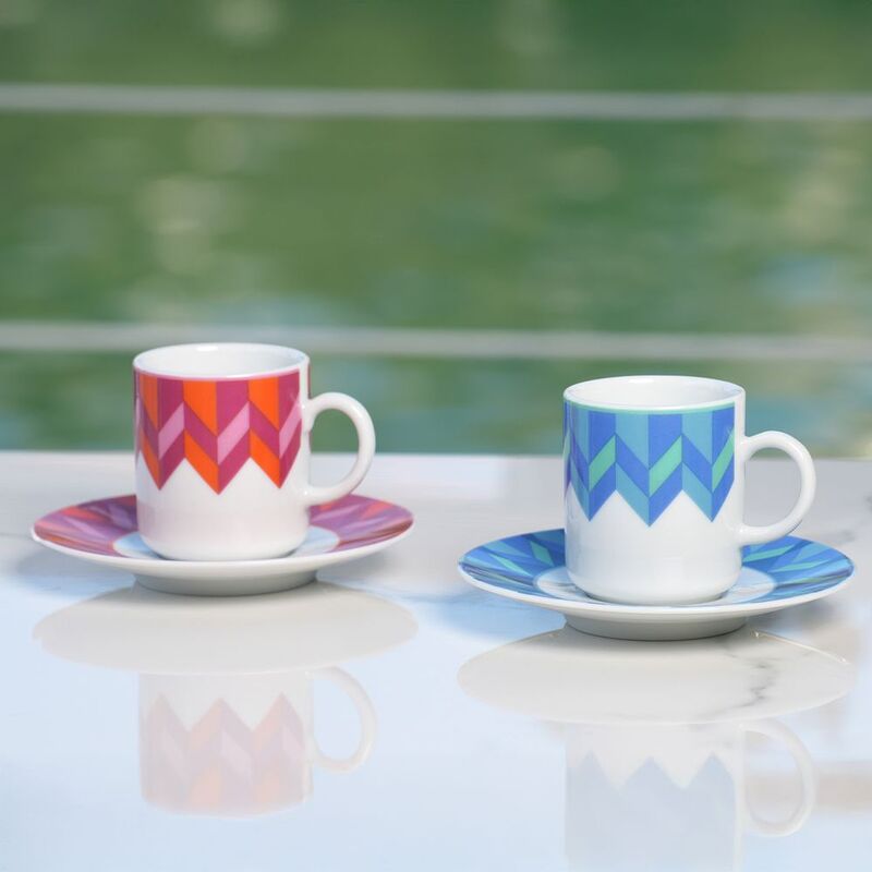 Add a splash of color to your espresso moments with the Set of 2 Bahja Espresso Cups & Saucers. Featuring bold patterns, one cup shines in green and blue, while the other glows in red and pink. A perfect fusion of artistry and energy, this set is designed to make every sip feel special.