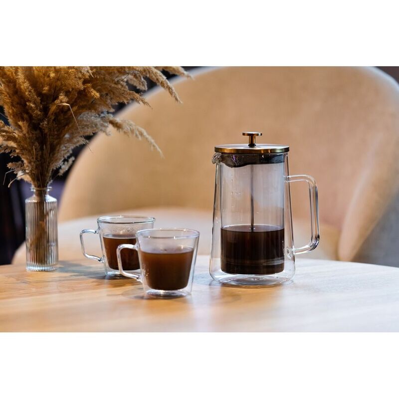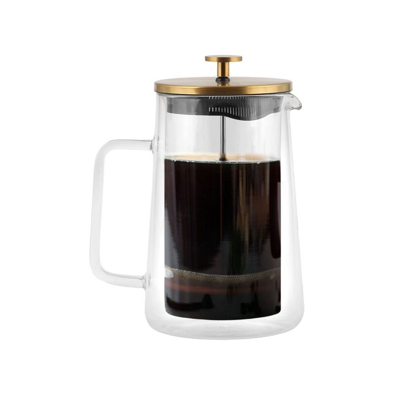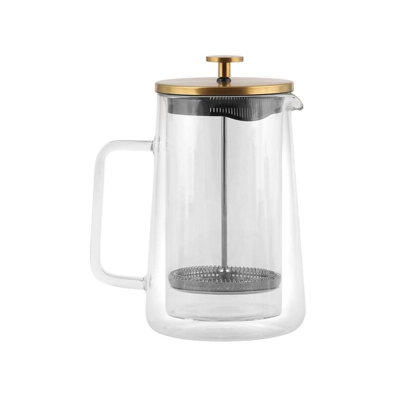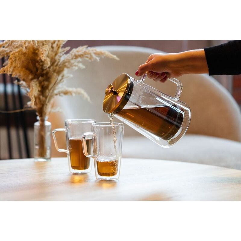 The double walls help to maintain the right temperature for longer, plus the outer wall insulates our hands from the heat. The transparent walls allow you to follow the brewing process and check the saturation of the brew, while the wide handle and spout make pouring easy. The jug is handmade from high-quality borosilicate glass that is safe for health and does not come into contact with the contents or affect their taste. It was fitted with a stainless steel lid in matt gold.