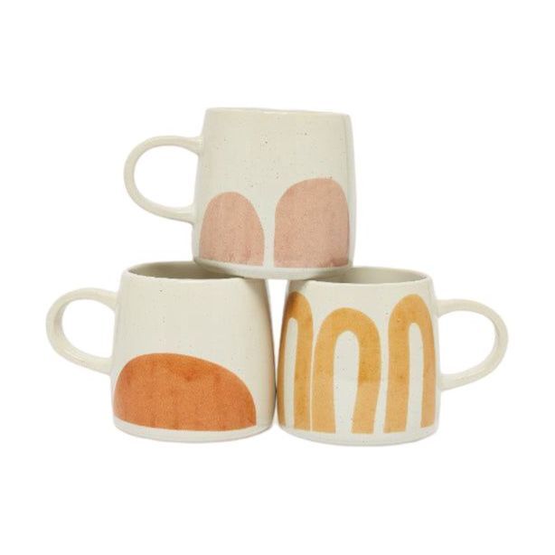 The "O'Keeffe" ceramic mugs feature earthy tones and calming shapes reminiscent of Georgia O'Keeffe's depictions of New Mexico. The warm beige and brown hues of the mug evoke the natural beauty of desert terrain, while the elegant curves and shapes provide a sense of tranquility and calm. Perfect for enjoying your morning coffee or tea, this mug will transport you to a peaceful place with every sip. Pick your favourite of three designs or opt for all three!