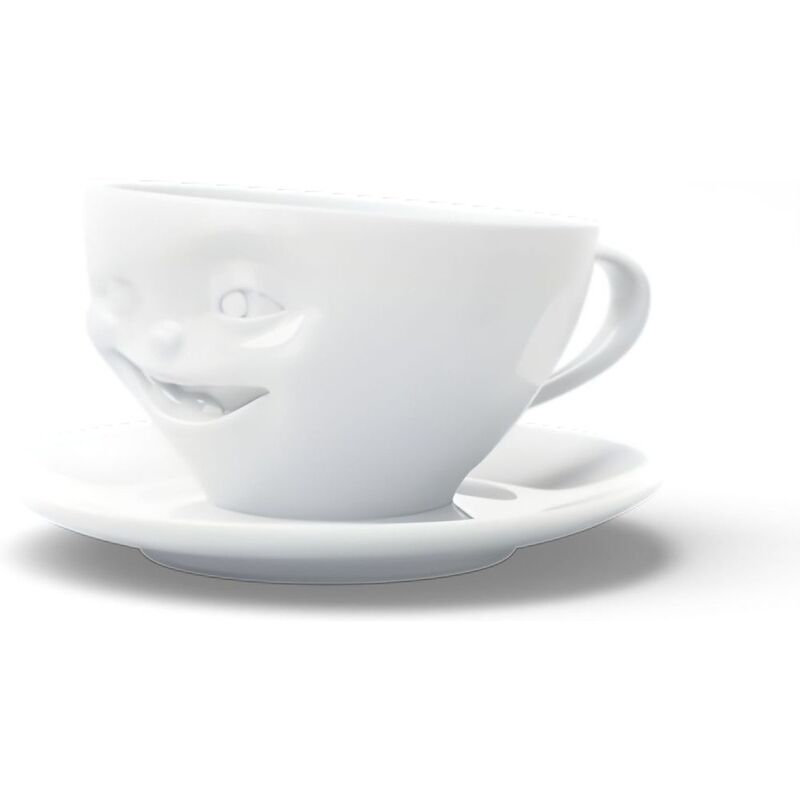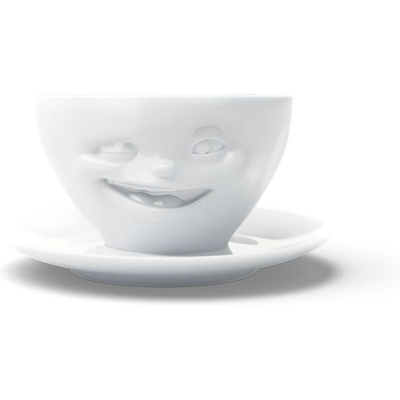 Inspired by the 'winking' emoji, his coffee cup at 6.5 oz capacity is a guaranteed conversation starter. Premium porcelain coffee cup with saucer in white from the TASSEN product family of fun dishware by FIFTYEIGHT Products.