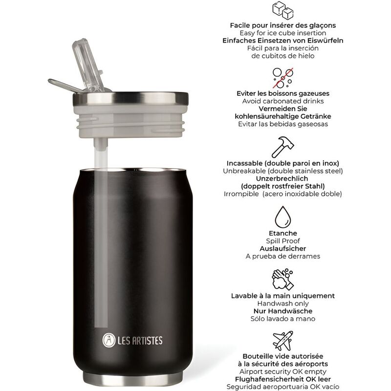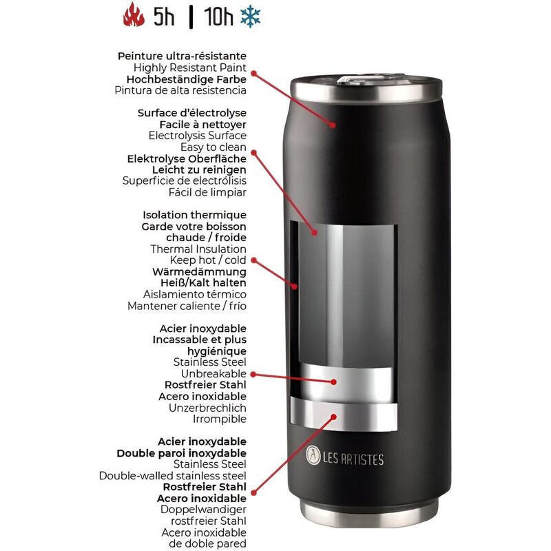 The isothermal can is an insulated flask designed as a can. Its double-wall stainless-steel technology maintain drinks hot for 5h and cold for 10h, with no impact on the drink's flavor.