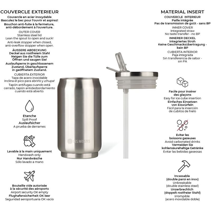 The isothermal can is an insulated flask designed as a can. Its double-wall stainless-steel technology maintain drinks hot for 5h and cold for 10h, with no impact on the drink's flavor.