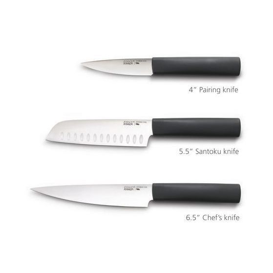 - Knives: 6½” (15.5cm) Chef’s knife, 5½” (14cm) Santoku knife, 4” (10cm) Paring knife
