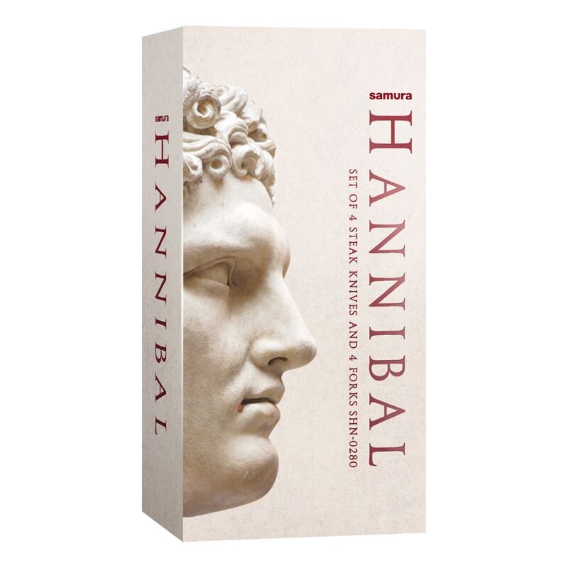 A remarkable 4-person knife set. The HANNIBAL series says to the dull, “Never again!” Fashioned for the world of steaks, HANNIBAL knives exemplify Samura’s love of ambitious design and exceptional performance. The smooth, elegant slopes give this set an original aesthetic, and the pearlescent handles give the HANNIBAL series an epicurean appearance that pairs nicely with any China.