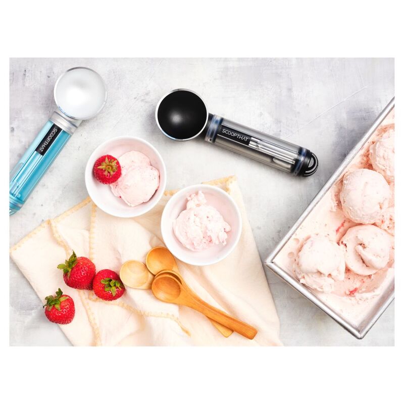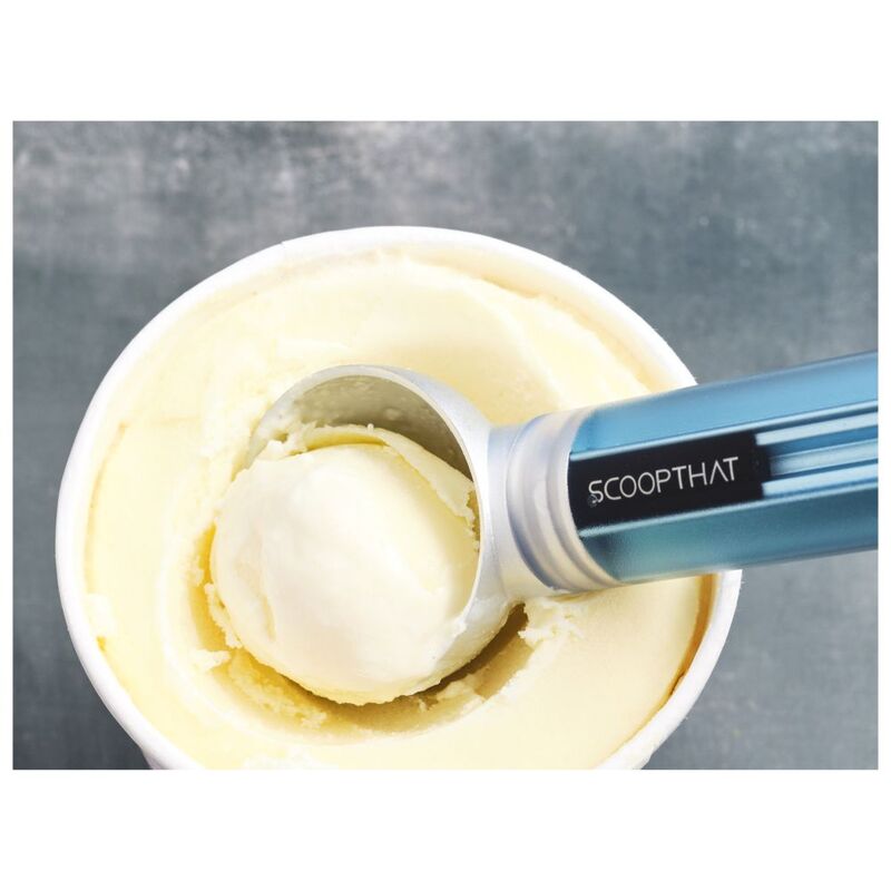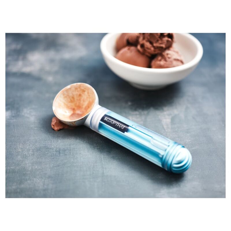 The revolutionary Scoop THAT! utilizes heat transfer principles to draw heat from a non-electric and self-replenishing biodegradable liquid reservoir inside the sealed handle. That perfect scoop of ice cream has never been so easy to make!