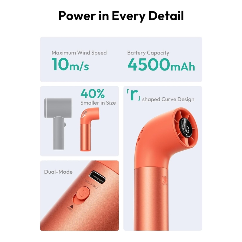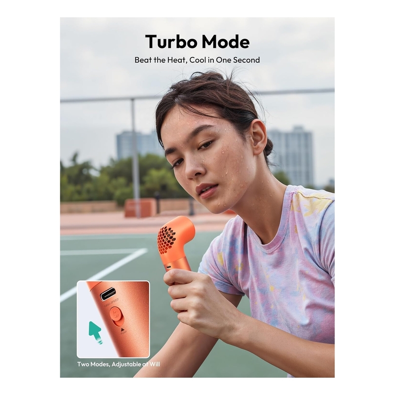Stay cool anywhere with the Aecooly Mini Aero Ultra, designed with a compact R-shaped grip for ergonomic comfort and portability. Powered by a 19,000 RPM brushless motor, it delivers turbo airflow up to 11 m/s for instant relief. With 7 adjustable speeds across dual modes (P-Mode and H-Mode), you can customize your cooling experience with ease. The sleek aluminum casing ensures durability and style, while the smart LED display lets you monitor speed and battery at a glance. Perfect for outdoor adventures, workouts, or everyday use.