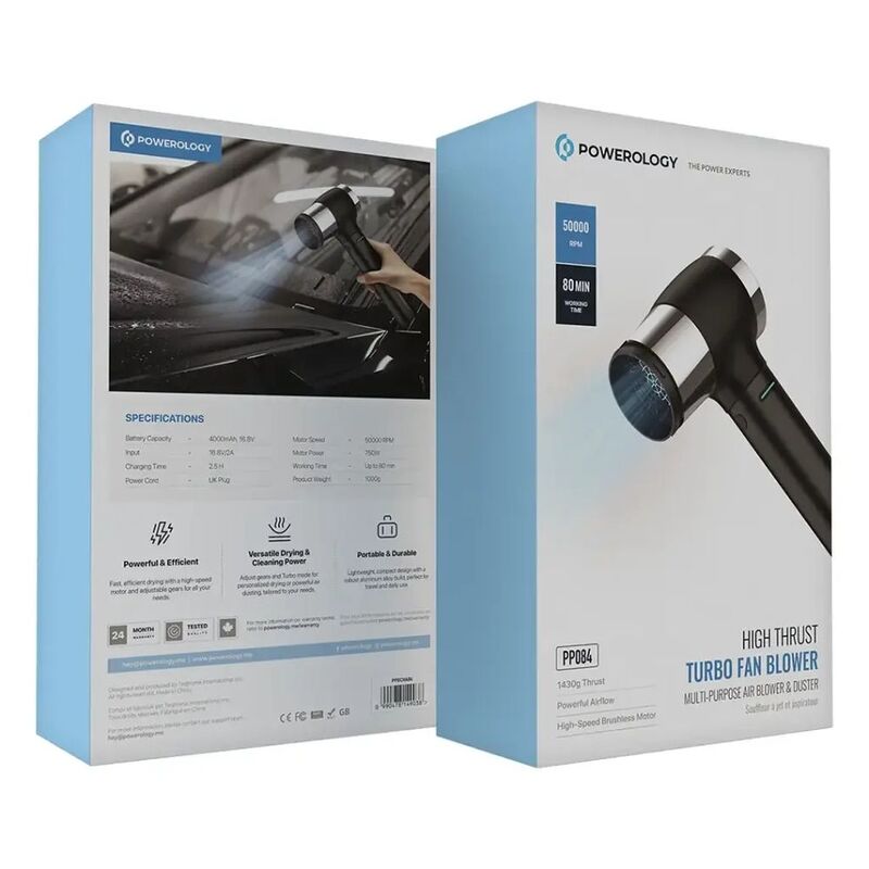 The Powerology High Thrust Turbo Fan Blower is a powerful, efficient instrument that performs diverse drying and cleaning actions. The blower is fitted with a high-performance 750W motor that spins at 50,000 rpm to impart high air pressure to its various applications. The 16.8V 4000mAh battery ensures complete cordless freedom for around 80 minutes of continuous blowing on a full charge. Then with a mere 2.5 hours to charge, the included power cord with the main plug allows the user flexibility of use. The 11-blade configuration amplifies thrust air pressure of 1430g for active drying and cleaning. The high-speed brushless motor assures the user of reliability and warranty that fits both home applications and professional efficiency. Being lightweight and portable, the blower suits any worker who needs a serious flow of air and does not want to beified with cords.