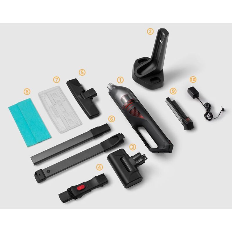 - Main body 2. Charging base 3. Mini-motorized pet brush 4. 2-in-1 crevice tool 5. Hard floor cleaning tool 6. pipe tools 7. Mopping module (x1) 8. disposable mopping cloths (x5) 9. Lithium-ion battery 10. AC adapter