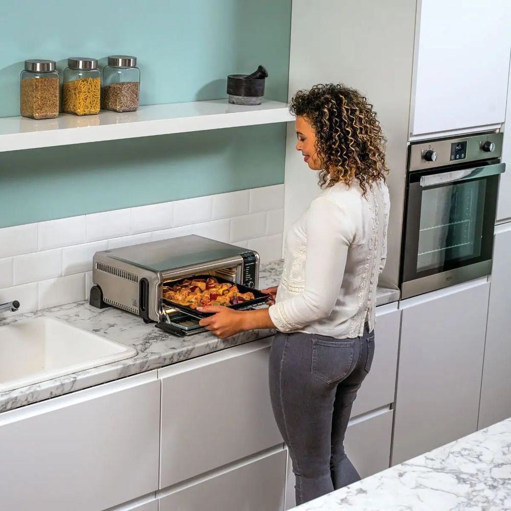Easily cook a 33cm pizza, 1kg of fries or 6 slices of bread in this a compact worktop oven. Includes a Baking Tray, Air Fry Basket and Wire Rack for versatile cooking results.