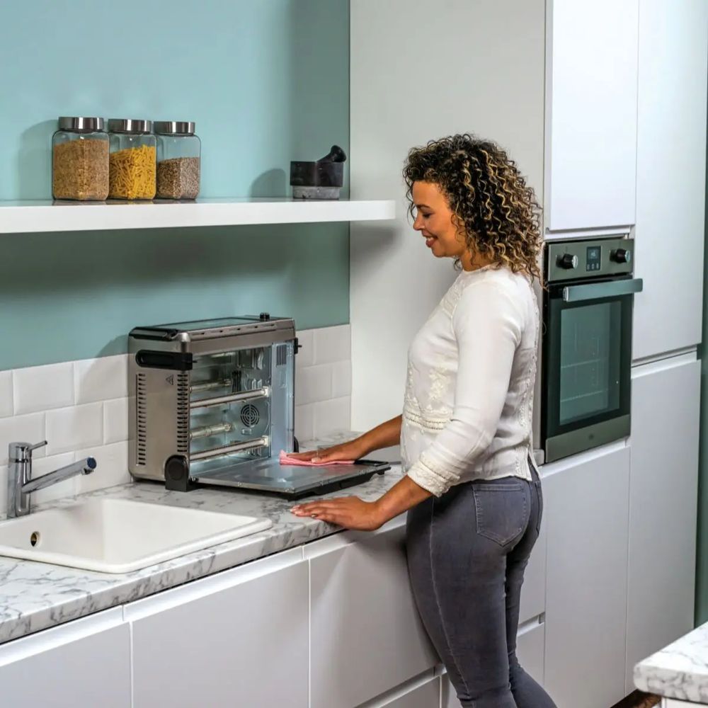 Reclaim your counterspace - The oven flips up and away for compact storage and easy cleaning. Store on its side to take up 50% less space.