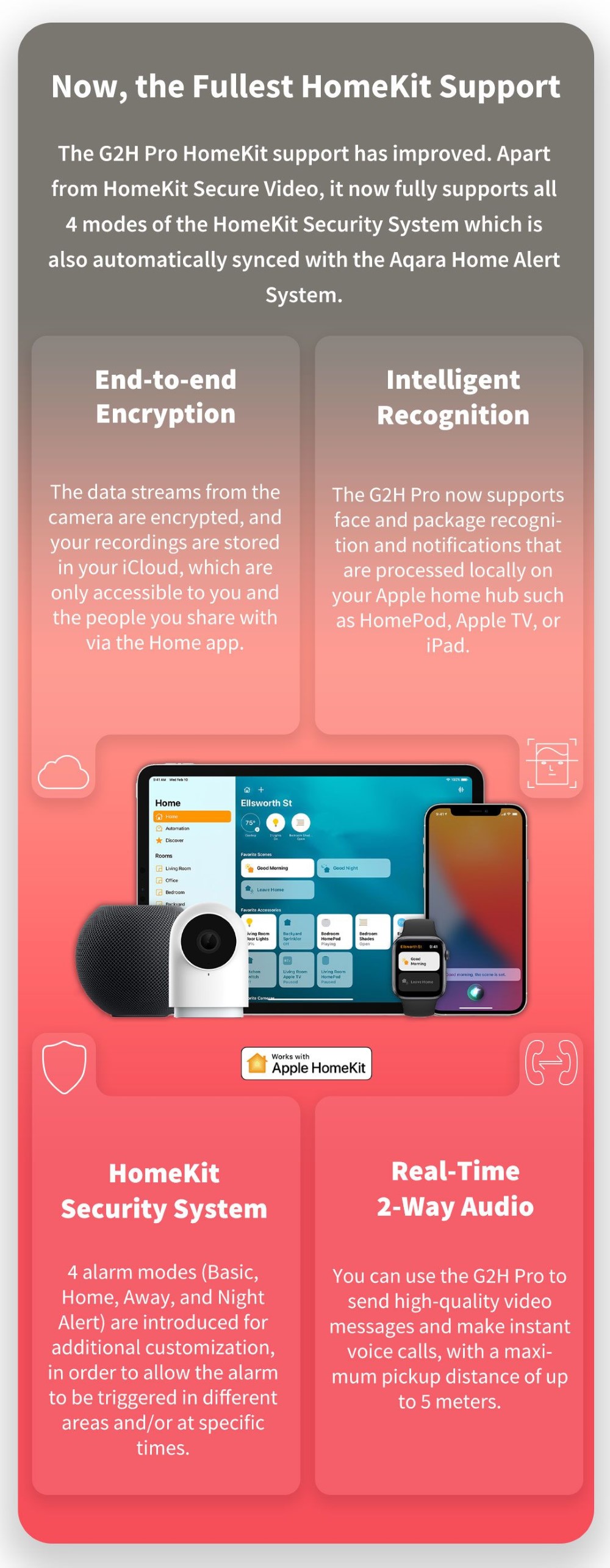 The Aqara G2H camera allows you to talk using the speaker and microphone, but it also has a number of other useful features such as camera preview visible in compatible applications like Eve, Home or Homecam. It is characterised by smooth operation. It allows you to store recorded videos in the Apple cloud for up to a week. The noteworthy advantages of the gateway also include motion capture and face recognition. With the camera, it is also possible to select a defined area to which the device should react. The camera ensures two-way communication. Aqara G2H is one of the best possible cameras for HomeKit. It works well with Apple HomeKit and also with Agara Home.