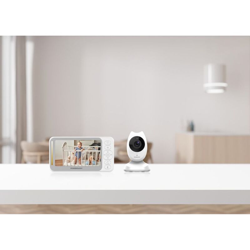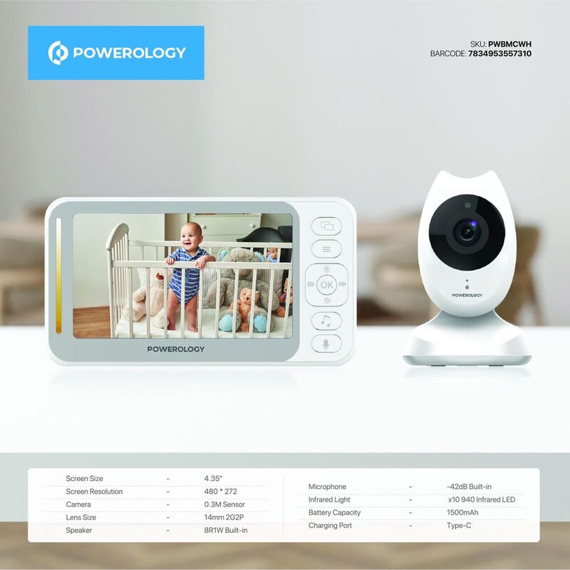 • This Powerology Smart Cam Baby Monitor is designed to provide monitoring capabilities for baby rooms or other spaces, with features like temperature monitoring, noise detection alerts, and infrared night vision, ensuring peace of mind for caregivers. The monitor's 4.35-inch screen offers a clear view of the monitored area, and the two-way audio allows communication between the monitor and the camera location.