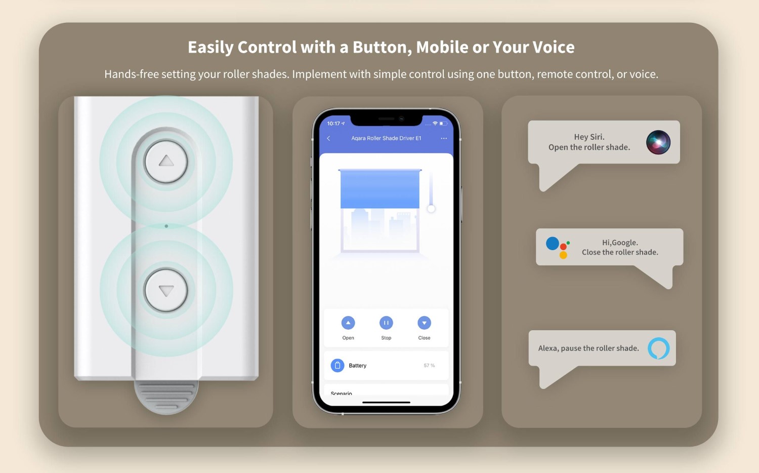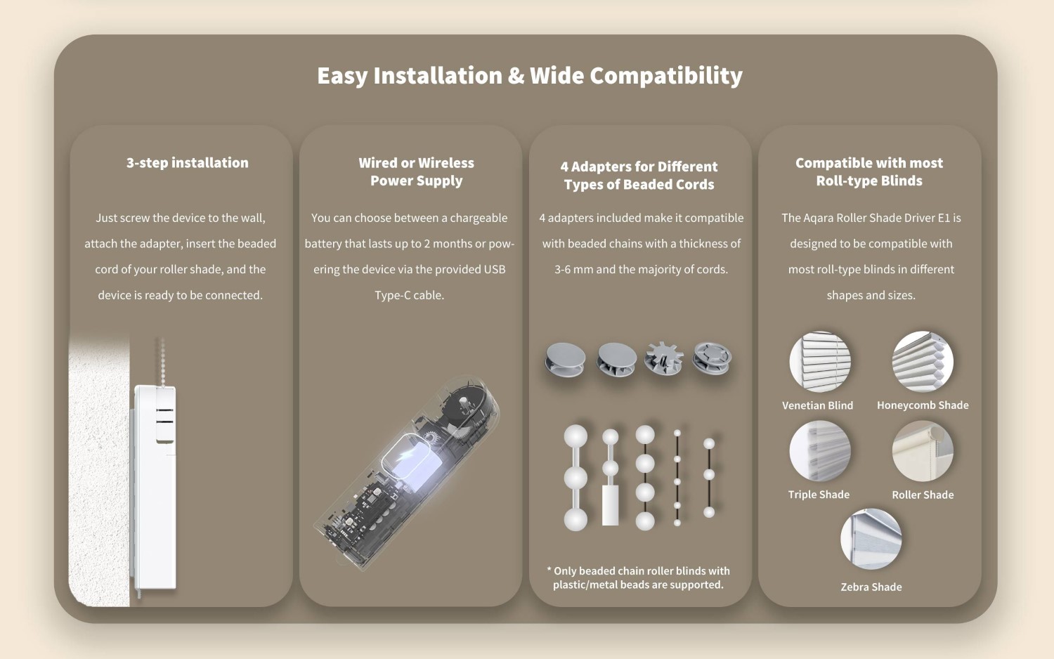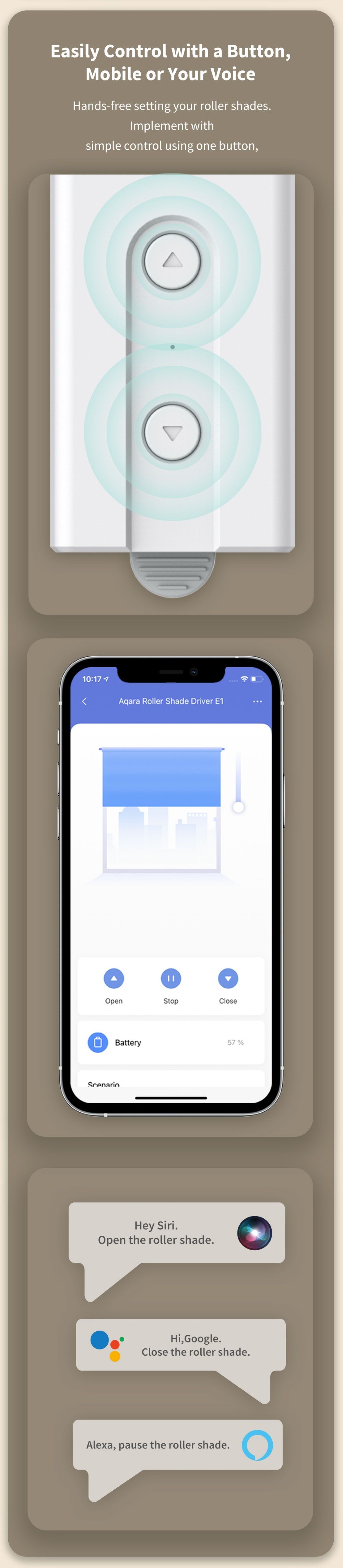 The Aqara Roller Shade Driver E1 is a revolutionary new device for automatic shutter control. Make your blinds, shades and anything else that opens with a control chain smart. The device is easy to install and battery powered.