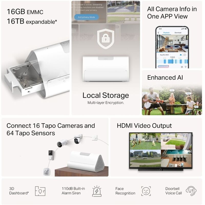 • Smart Home Ecosystem Center: Capable of connecting up to 16 Tapo cameras and 64 sensors to build your smart home ecosystem.