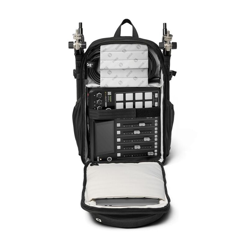 The RØDE Backpack is a custom-designed carry bag for the RØDECaster series, including the RØDECaster Pro or RØDECaster Pro II. Made from high-quality materials, including a soft, durable Alcantara® handle, ballistic nylon straps and water-resistant exterior, it is rugged and hard-wearing. It can accommodate a RØDECaster Pro or Pro II, plus microphones, studio arms and other accessories, as well as laptops up to 16 inches. Ergonomic adjustable shoulder straps with back and chest support ensure absolute comfort, with exterior pockets and compartments providing additional storage.