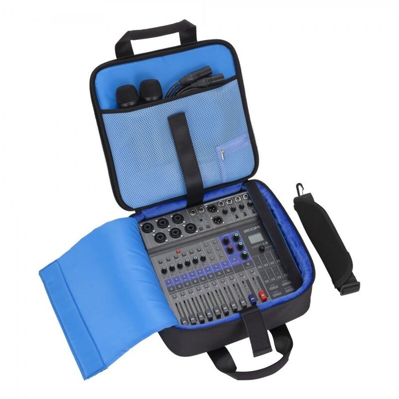 The CBL-8 is semi-hard carrying bag made with EVA (Ethylene-Vinyl Acetate) material. It carries a LiveTrak™ L-8 as well as their accessories such as power adapter, cables and SD cards, and you can take them comfortably. It has stretch-bands to fix the unit securely and pads protect from damage and shock. And also it comes with a shoulder strap with pads to reduce load of weight.