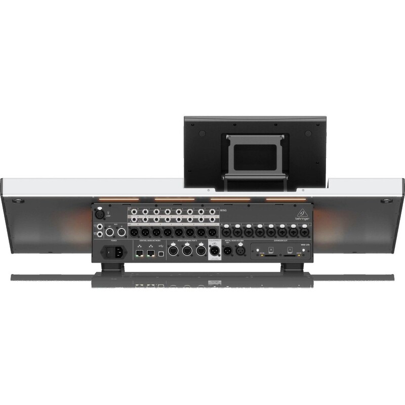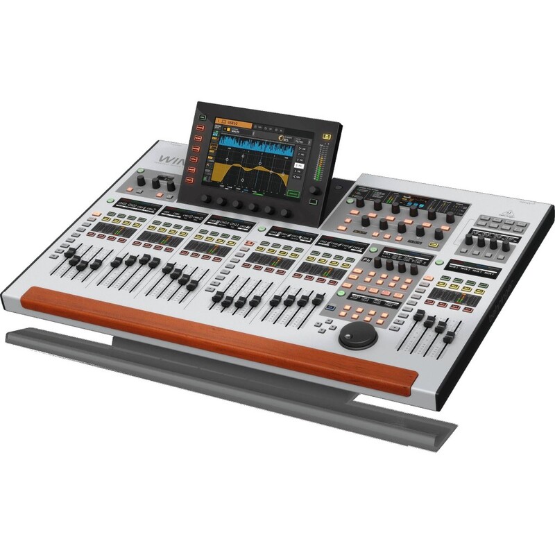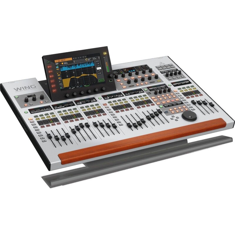The WING control surface utilizes a large capacitive touchscreen interface with touch-sensitive rotary controls for a new ease of operation. Three separate fader sections and a Custom Controls section can be tailored easily and intuitively to meet your personal requirements. No matter if you need a specific bus send fader next to the corresponding channel fader, or a dedicated “money” channel always at your fingertip, or even sharing the surface with two engineers - WING can be configured to elevate your production to a new level. You can even replace and customize the massive wooden armrest with something funkier if you like. The technical drawing can be found in the Downloads section of the product page.